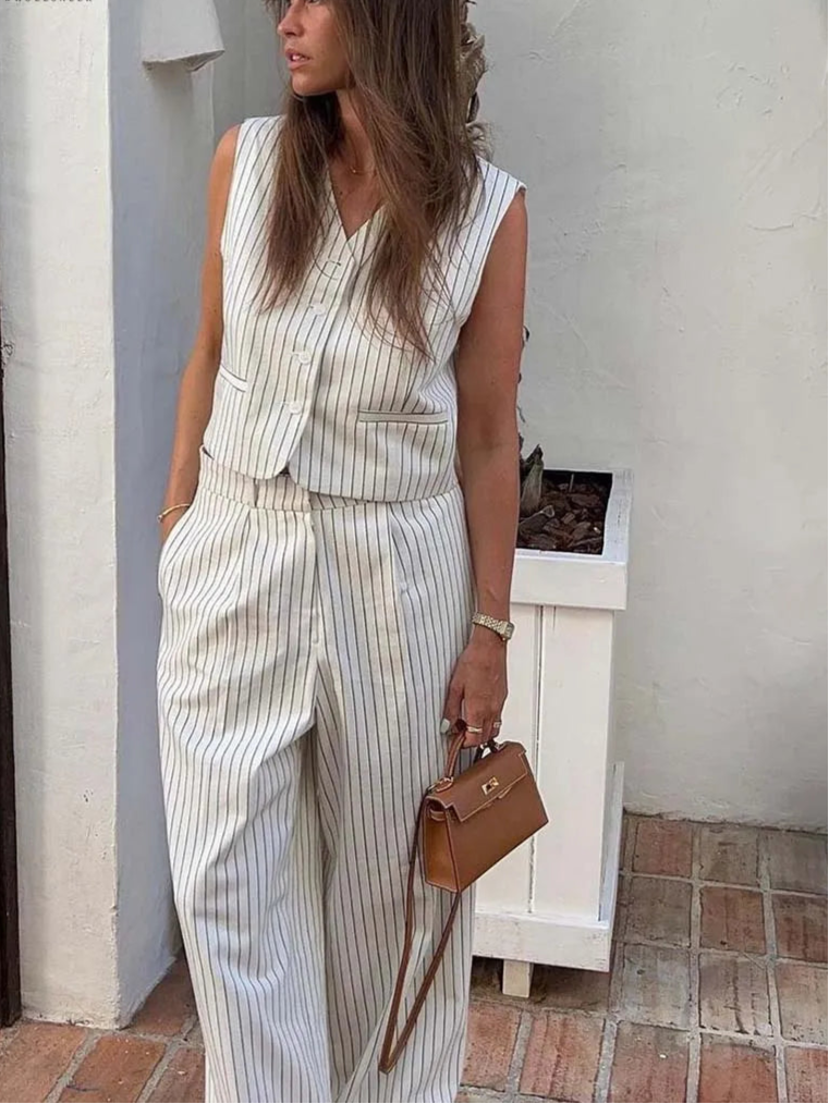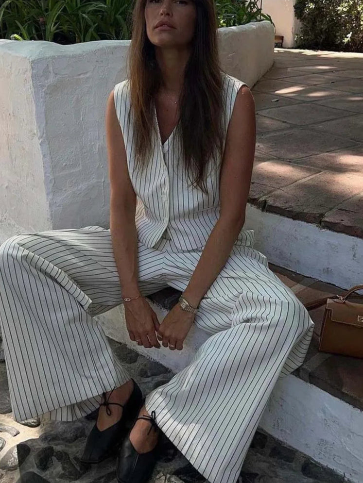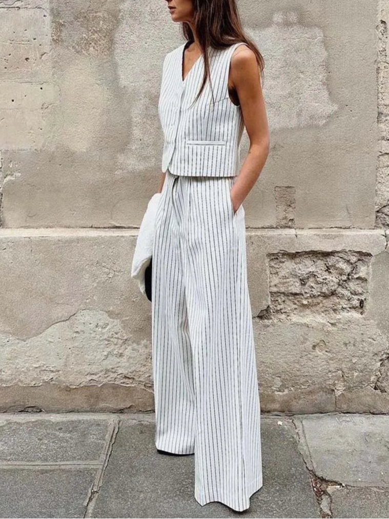 O branco sofisticado ganha um charme extra com a risca de giz, trazendo leveza e modernidade para o look. A calça reta de cintura alta, com elástico confortável, valoriza a silhueta sem abrir mão da praticidade. Um conjunto casual e elegante, perfeito para quem busca estilo versátil que transita do dia a dia ao encontro especial.
